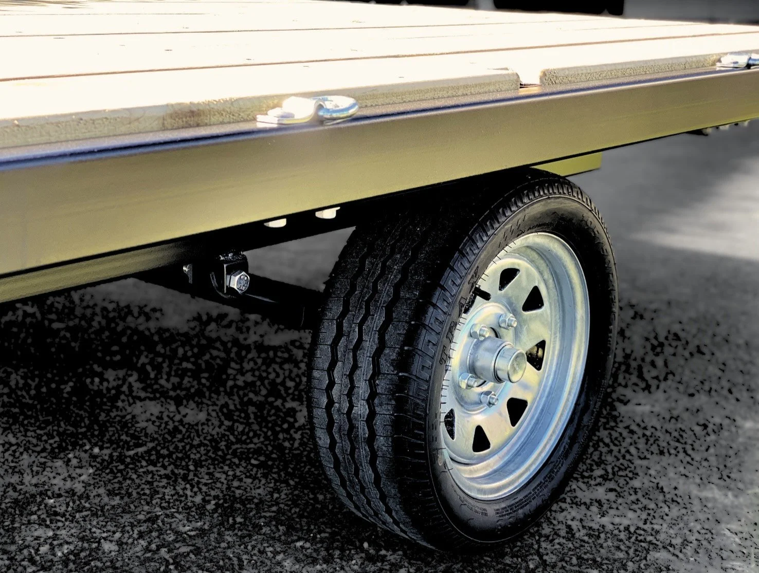 Low profile 13 inch Galvanised trailer wheel, rated for 900kg per tyre fixed to a single axle with 1.5 tonne spring rating.